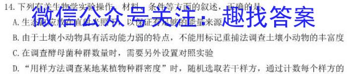 14.下列有关生物学实验操作、材料、条件等方面的叙述,正确的是A.生态缸应放在直射光照下,以保证有足够的能量来源B.由于土壤小动物具有活动能力弱的特点,不能用标记重捕法调查土壤小动物的丰富度C.在调查酵母菌种群数量时,需要另外设置对照实验