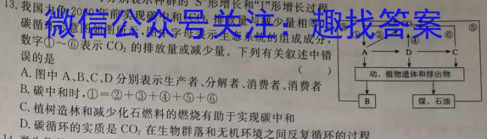 D.图1和图2可分别表示种群的“s”形增长和“J”形增长过程13.我国力争2060年前实现碳中和(CO,排放量与减少量相等)。(CO2碳循环示意图如图所示,图中字母表示生态系统的组成成分,数字①~⑥表示CO2误的是的排放量或减少量。下列有关叙述中错()A.图中A、B、C、D分别表示生产者、分解者、消费者、消费者B.碳中和时,①=②③④C.植树造林和减少化石燃料的燃烧有助于实现碳中和D.碳循环的实质是CO2在生物群落和无机环境之间反复循环的过程