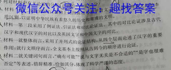 2.下列对材料中有关论证的分析A.(正确的一项是(3分)和构造原理创造了自己的民族文字,这种文字都属于“汉字系文字”。AA.材料一第二段提到岩石、器物上的图画符号和甲骨文,旨在说明两者之间的本器物物上质区别,以证明中华民族有着悠久的历史和璀璨的文明。材材料一第三段采用了例证法、引证法和对比论证法。其中的对比论证涉及古代汉字和现代汉字的对比以及英国文字和中国文字的对比。C.材料一就整体而言,采用了并列式的论证结构,从四个层面论述了汉字的重要作用;就行文顺序而言,全文基本上按照从古到今的顺序进行论证。D.材料二就关键词句而言,“确有可能”“说与文字无关是不合适的”“是字也很难否定”等表述,措辞精准,恰如其分,体现了科学严谨的态度。。