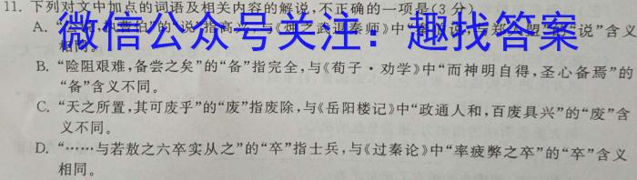 11.下列对文中加点的词语及相关内容的解说,不正确的一项是(3分)A.“公说,执曹伯”的“说”指高兴,与《烛之武退秦师》中“秦伯说,与郑人盟”的“说”含义相同。B.“险阻艰难,备尝之矣”的“备”指完全,与《荀子·劝学》中“而神明自得,圣心备焉”的“备”含义不同。C.“天之所置,其可废乎”的“废”指废除,与《岳阳楼记》中“政通人和,百废具兴”的“废”今义不同。D.^66,……与若敖之六卒实从之”的“卒”指士兵,与《过秦论》中“率疲弊之卒”的“卒”含义相同。