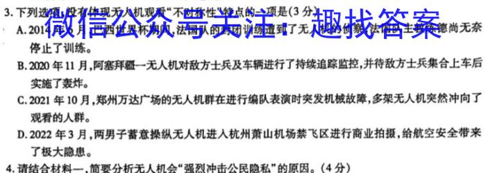 3.下列选项,没有体现无人机观看“不对称性”特点的一项是(3分)A.2014年6月,巴西世界杯期间,法国队的封闭训练遭到了无人机的侦察,法国队主教练德尚无奈停止了训练。B.2020年11月,阿塞拜疆一无人机对敌方士兵及车辆进行了持续追踪监控,并待敌方士兵集合上车后实施了轰炸。C.2021年10月,郑州万达广场的无人机群在进行编队表演时突发机械故障,多架无人机突然冲向了观看的人群。D.2024年3月,两男子蓄意操纵无人机进入杭州萧山机场禁飞区进行商业拍摄,给航空安全带来了极大隐患。4.请结合材料一,简要分析无人机会“强烈冲击公民隐私”的原因。(4分)
