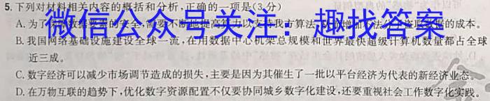 5.下列对材料相关内容的概括和分析,正确的一项是(3分A.为了保障数据要素的安全,需要不断地提高算力以支持我方算法,从而增加不法分子盗取数据的成本。B.我国网络基础设施建设全球一流,在用数据中心机架总规模和世界最快超级计算机数量都占全球近三成。C.数字经济可以减少市场调节造成的损失,主要是因为其催生了一批以平台经济为代表的新经济业D.在万物互联的趋势下,优化数字资源配置不仅要协同城乡数字化建设,还要重视社会工作数字化实践。