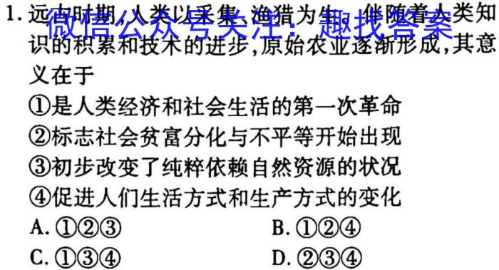 1.远古时期,人类以采集、渔猎为生。伴随着人类知识的积累和技术的进步,原始农业逐渐形成,其意义在于①是人类经济和社会生活的第一次革命②标志社会贫富分化与不平等开始出现③初步改变了纯粹依赖自然资源的状况④促进人们生活方式和生产方式的变化A.①②③B.①②④C.①③④D.②③④