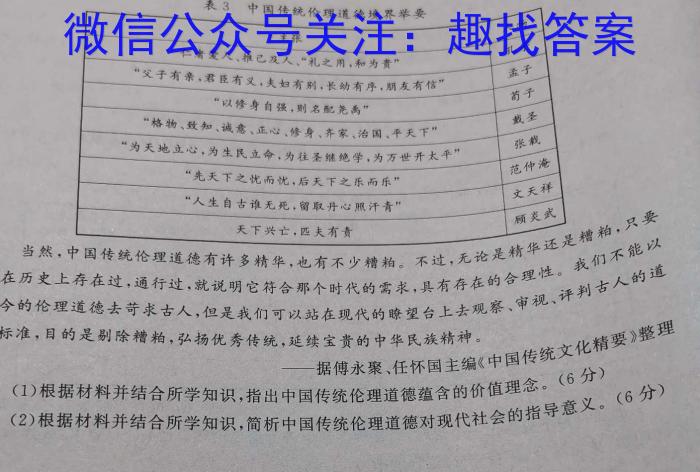 材料粕,当然,中国传统伦理道德有许多精华,也有不少糟粕。不过,无论是精华还是糟粕,能认它在历史上存在过,通行过,就说明它符合那个时代的需求,具有存在的合理性。性。我的当今的伦理道德去苛求古人,但是我们可以站在现代的瞭望台上去观察、审视、评判古人的道台上上去德标准,目的是剔除糟粕,弘扬优秀传统,延续宝贵的中华民族精神。据傅永聚、任怀国主编《中国传统文化精要》整理分。(6分)(1)根据材料并结合所学知识,指出中国传统伦理道德蕴含的价值理念。(6分)(2)根据材料并结合所学知识,简析中国传统伦理道德对现代社会的指导意义。