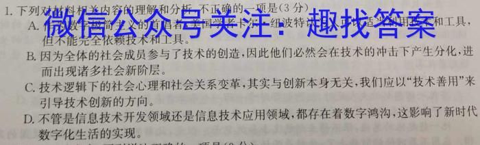 1.下列对材料相关内容的理解和分析,不正确的一项是(3分)A.作为数字极简主义的首倡者,美国学者卡尔·纽波特认为人可以适当利用技术和工具,但不能完全依赖技术和工具。B.因为全体的社会成员参与了技术的创造,因此他们必然会在技术的冲击下产生分化,进而出现诸多社会新阶层。C.技术逻辑下的社会心理和社会关系变革,其实与创新本身无关,我们应以“技术善用”来引导技术创新的方向。D.不管是信息技术开发领域还是信息技术应用领域,都存在着数字鸿沟,这影响了新时代数字化生活的实现。
