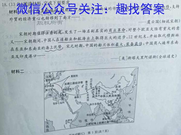 18.(13分)阅读材料,完成下列要求,材料一由于西夏的崛起,断了中原王朝通往西域的传统商路,更因经济重心的南移,支持特心也转移到了南方…外贸的经济重版权所有虞云国《细说宋朝月》宋朝时期值得注意的是,发生了一场名副其实的商业革命,对整个欧亚大陆有重大的意意义………宋朝期间,中国人在造船业和航海业上取得巨大的进步,12世纪末,开始取代穆斯林在东亚和东南亚的海上优势。宋元时期,中国的船只体积最大,装备最佳;中国商人遍布东南亚亚及印度港口….[美]斯塔夫里阿诺斯《全球通史》材料二