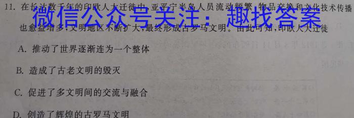 11.在长达数千年的印欧人大迁徙中,亚平宁半岛人员流动频繁,物品交换和文化技术传播也愈益增多,文明地区不断扩大,最终形成古罗马文明。由此可知,印欧人大迁徙A.推动了世界逐渐连为一个整体B.造成了古老文明的毁灭C.促进了多文明间的交流与融合D.创造了辉煌的古罗马文明
