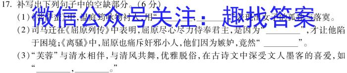 17.补写出下列句子中的空缺部分。(6分)(1)《菩萨蛮》中,温庭筠咏物衬人,用“,”表现出女子的孤独与落寞。(2)司马迁在《屈原列传》中表明,屈原尽心尽力侍奉君主,是因为“”,才让他陷于困境;《离骚》中,屈原也痛斥奸邪小人,他们因为嫉妒,竟然“”。(3)“芙蓉”与清水相伴,与清风共舞,优雅脱俗,在古诗文中深受文人墨客的喜爱,如“,。