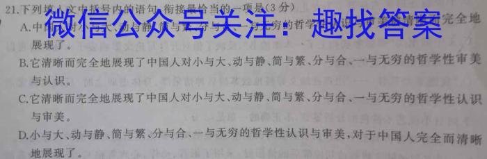 21.下列填人文中括号内的语句,衔接最恰当的一项是(3分)A.中国人对小与大、动与静、简与繁、分与合、一与无穷的哲学性认识与审美被清晰而完全地展现了。B.它清晰而完全地展现了中国人对小与大、动与静、简与繁、分与合、一与无穷的哲学性审美与认识。C.它清晰而完全地展现了中国人对小与大、动与静、简与繁、分与合、一与无穷的哲学性认识与审美。D.小与大、动与静、简与繁、分与合、一与无穷的哲学性认识与审美,对于中国人完全而清晰地展现了。