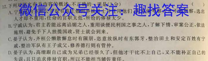 12.下列对原文有关内容的概述,不正确的一项是(3分)()A.宁戚认为齐桓公并没有真正做到举拔贤士并任用他们,因为他考察人才不能明察,选出人才却不重用,任命的官职太低,所给的俸禄太少。B.宁戚认为,君主若能远离谄媚之人,重用谈便民利国之事之人,了解下情,审案公正,依法施刑,避免手下人独揽国政,贤士就会到来。C.晏子认为,齐桓公懒散懈怠时有朋,恣意放纵时有东郭牙,整治田土和安定百姓有宁戚,整治军队有王子成父,修养德行则有管仲。D.晏子认为,高缭跟自己成为兄弟已经很久了,但他才干比不上自己,又不能补正自己的失误,且只追求俸禄官职,所以不能担当辅佐重任。
