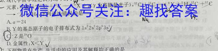 6.现代字宙学理论认为现今的宇宙起源于一次“大爆炸”,该过程中发生“碳燃烧”形成了其他C元素,可表示为^12C+^12C-x+y(y为高能量光子),^12C+^12C^bY+^1H,^12C+^12C2+^4He,下列说法错误的是23.A.a=2424.B.子的电子排布式为1s^22s^22p^63s^1C*Z是^20OD.金属性:X<1