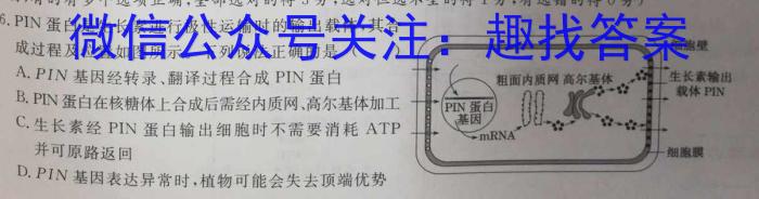 16.PIN蛋白是生长素进行极性运输时的输出载体,其合成过程及位置如图所示。下列说法正确的是()A.PIN基因经转录、翻译过程合成PIN蛋白B.PIN蛋白在核糖体上合成后需经内质网、高尔基体加工C.生长素经PIN蛋白输出细胞时不需要消耗ATP并可原路返回D.PIN基因表达异常时,植物可能会失去顶端优势