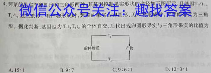 4.荠菜的果实有卵圆形和三角形两种,其基因控制果实形状的途径如下图所示,且基因T1/l1,T2/l2独立遗传。有产物形成时,荠菜的果实为卵圆形,无产物形成时,荠菜的果实为三角形。据此判断,基因型为T1L1T2l2的个体自交,后代出现卵圆形果实与三角形果实的比值为A.15:1B.9:7C.9:6:1D.12:3:1