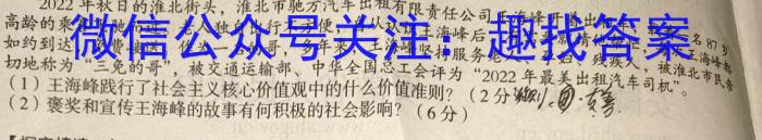 14.(8分)2024年秋日的淮北街头,淮北市驰方汽车出租有限责任公司王海峰开着出租车,载着一名高龄的乘客飞驰而过。老人独自出行不方便,自从认识王海峰后,有需要就请他帮忙,每次玉海峰如约到达,免费接送。作为一名的哥,多年来,王海峰坚持服务老人、孕妇、残疾人,被淮北市民切地称为“三免的哥”,被交通运输部、中华全国总工会评为“2024年最美出租汽车司机”。北22(1)王海峰践行了社会主义核心价值观中的什么价值准则?(2分(2)褒奖和宣传王海峰的故事有何积极的社会影响?(