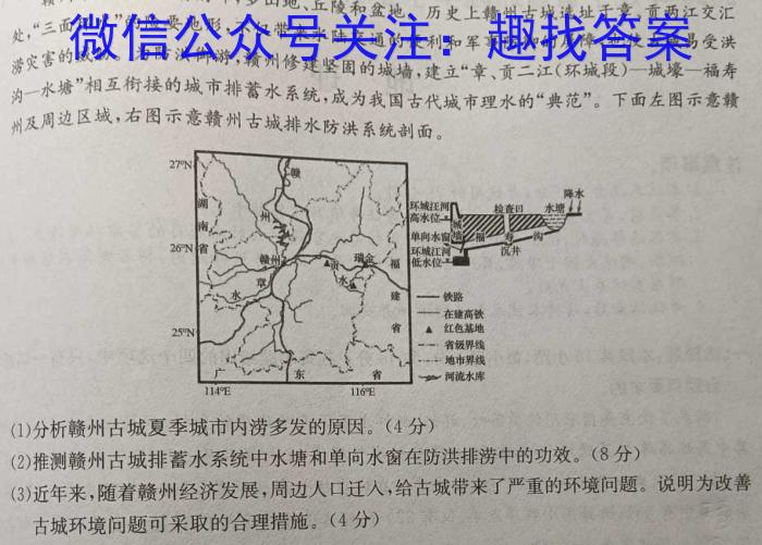 赣州市位于江西省南部,多山地、丘陵和盆地。历史上赣州古城选址于章、贡两江交汇处,“三面环水”的险要地形,不仅带来水陆交通的便利和军事防御的屏障,也使古城易受洪涝灾害的威胁。为防洪御游,赣州修建坚固的城墙,建立“章、贡二江(环城段)一城壕一福寿沟一水塘”相互衔接的城市排蓄水系统,成为我国古代城市理水的“典范”。下面左图示意赣州及周边区域,右图示意赣州古城排水防洪系统剖面。(1)分析赣州古城夏季城市内涝多发的原因。(4分)(2)推测赣州古城排蓄水系统中水塘和单向水窗在防洪排涝中的功效。(8分)(3)近年来,随着赣州经济发展,周边人口迁入,给古城带来了严重的环境问题。说明为改善古城环境问题可采取的合理措施。(4分)