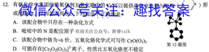 12.有机化学中常用的强氧化剂五氧化铬中的Cr可以提供杂化空轨道与吡啶(N)形成配合物,结构如图所示,下列说法不正确的是A.该配合物中只存在一种杂化方式B.吡啶中的N是配位原子欢迎关注公众号:浙睿talkC.该配合物中铬为+6价,五氧化铬化学式可写作CrO(O2)2D.可能存在[Cr2O2(O2)5]^2-离子,性质比五氧化铬更不稳定