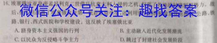 16.埃塞俄比亚皇帝孟尼利克二世借反抗意大利人侵的之机,扫荡了各地的封建制据势力。战后,他不但派了埃塞俄比亚第一批赴欧留学生,还利用意大利的赔款加快电报线,公路、铁路、银行、西式医院和学校建设。这反映了埃塞俄比亚A.跻身资本主义强国的行列B.主动融人近代化发展潮流C.以民众为反侵略斗争主力D.跳过了封建社会发展阶段