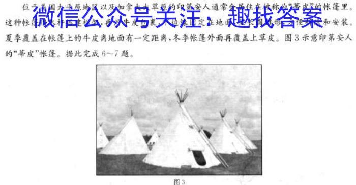 位于美国大平原地区以及加拿大大草原的印第安人通常会居住在被称为“蒂皮”的帐篷里。这种帐篷用木杆搭建框架,再用牛皮包裹,下边缘固定在地面,呈长圆锥形,方便拆除和安装。夏季覆盖在帐篷上的牛皮离地面有一定距离,冬季帐篷外面再覆盖上草皮。图3示意印第安人的“蒂皮”帐篷。据此完成~7题。