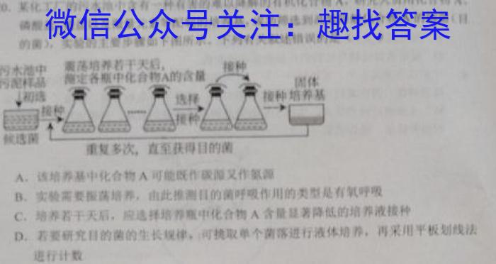 20.某化工厂的污水池中含有一种有害的难以降解的有机化合物A.,研究人员用化合物A、磷酸盐、镁盐以及微量元素等配制的培养基,成功选到高效降解化合物A的细菌(的菌),实验的主要步骤如下图所示。下列有关叙述错误的是()污水池中震荡培养若于天后,接种测定各瓶中化合物A的含量接种培养基候选重复多次,直至获得目的菌A.该培养基中化合物A可能既作碳源又作氨源B.实验需要振荡培养,由此推测目的菌呼吸作用的类型是有氧呼吸C.培养若干天后,应选择培养瓶中化合物A含量显著降低的培养液接种D.若要研究目的菌的生长规律,可挑取单个菌落进行液体培养,再采用平板划线法进行计数