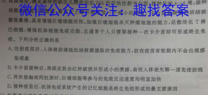 18.我国规定,满足条件的新生儿需在出生24h后尽快注射卡介苗,接种后的4一6周,接种局部会形成小的溃疡,最后在上臂外侧形成一个微小的疤痕。卡介苗是减毒的活结核菌混悬液,具有增强巨噬细胞活性,加强巨噬细胞杀灭肿瘤细胞的能力,还能活化T淋巴细胞,增强机体细胞免疫功能,且通常个人只需要接种一次卡介苗即可形成终生免疫。下列分析正确的是A.注射疫苗后,人体将获得抵抗结核菌感染的免疫能力,故在疫苗有效期内不会出现感染现象B.卡介苗接种后,局部皮肤会红肿破损并形成小的溃疡,表明人体丧失第一道免疫防线C.再次接触相同抗原时,巨噬细胞等参与的免疫反应速度均明显加快D.接种疫苗后,机体免疫系统产生的记忆细胞是终生免疫形成的最主要原因