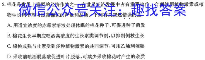 9.棉花是世界上重要的经济作物之一,在世界经济发展中占有重要地位。合理使用植物激素或植物生长调节剂可提高棉花的产量和品质。下列有关叙述错误的是A.用适宜浓度的赤霉素溶液处理休眠的棉花种子,可促进种子萌发B.棉花生长早期应喷洒高浓度的生长素类调节剂,以抑制侧枝生长C.棉桃成熟与吐絮受到多种植物激素的共同调节,可用乙烯利催熟D.采收前喷洒脱落酸促进叶片脱落,可减少采收棉花时产生的杂质
