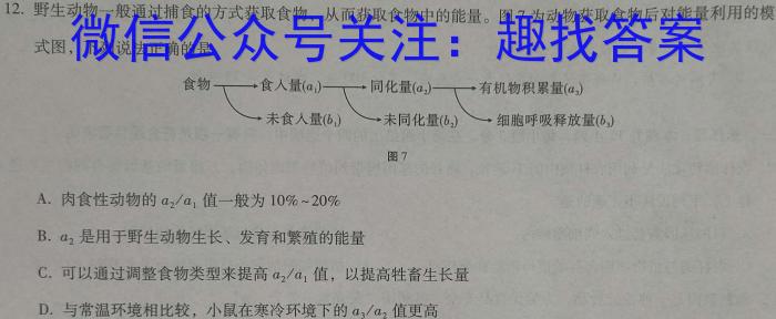 12.野生动物一般通过捕食的方式获取食物,从而获取食物中的能量。图7为动物获取食物后对能量利用的模式图,下列说法正确的是食物食入量(a1)同化量(a2)有机物积累量(a3)未食人量(b)未同化量(b2)→细胞呼吸释放量(b3)图7A.肉食性动物的a2/a1值一般为10%20%B.a2是用于野生动物生长、发育和繁殖的能量C.可以通过调整食物类型来提高a2/a1值,以提高牲畜生长量D.与常温环境相比较,小鼠在寒冷环境下的a3/a2值更高