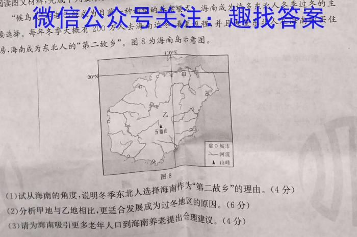 18.阅读图文材料,完成下列要求。(14分)“候鸟式”养老已经成为目前一种新型的养老模式。海南成为许多东北人冬季过冬的主要选择。每年冬季大概有200万人去海南过冬,春夏返程,并且大量东北人在海南购买住房,海南成为东北人的“第二故乡”。图8为海南岛示意图。u20^(1)试从海南的角度,说明冬季东北人选择海南作为“第二故乡”的理由。(4分)(2)分析甲地与乙地相比,更适合发展成为过冬地区的原因。(6分)(3)请为海南吸引更多老年人口到海南养老提出合理建议。(4分)