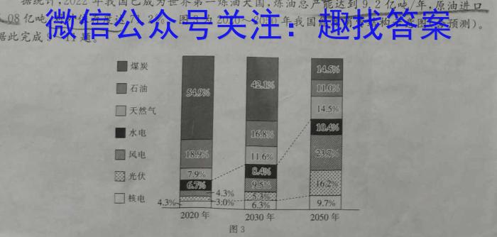 据统计,2024年我国已成为世界第一炼油大国,炼油总产能达到9.2亿吨/年,原油进口5.08亿吨,对外依存度达71.2%。图3为2020~2050年我国能源消费结构示意图(含预测)。据此完成9∼11题。■煤炭口天然气■水电图光伏图3