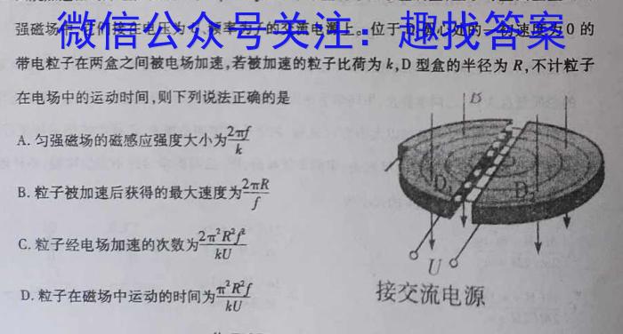 9.回旋加速器的原理如图所示。D1和D2是两个中空的半圆形金属盒,置于与盒面垂直的匀强磁场中,它们接在电压为U、频率为f的交流电源上。位于D1圆心处的一初速度为0的带电粒子在两盒之间被电场加速,若被加速的粒子比荷为k,D型盒的半径为R,,不计粒子在电场中的运动时间,则下列说法正确的是B.粒子被加速后获得的最大速度为A.匀强磁场的磁感应强度大小为2k2RfC.粒子经电场加速的次数32^2R^2kUD.粒子在磁场中运动的时间为^2R^2fkU接交流电源