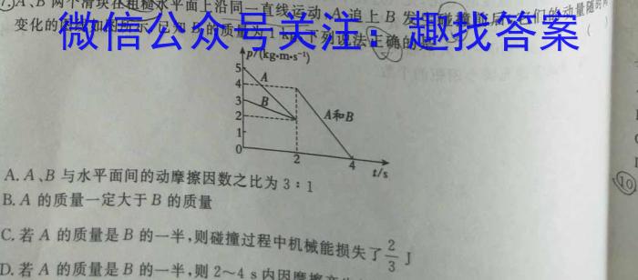 两个滑块在粗糙水平面上沿同一直线运动,A追上B发生变化的图线如图所示.已知B的质量为1kg,下列说法碰撞前后,它们的动量随(正确的是A.A、B与水平面间的动摩擦因数之比为3:1t/sB.A的质量一定大于B的质量C.若A的质量是B的一半,则碰撞过程中机械能损失223jD.若A的质量是B的一半,则2~4s内因摩擦产生的热量为5J
