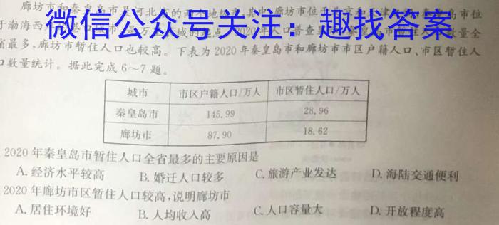 廊坊市和秦皇岛市是河北省的两个地级市,其中,廊坊市位于北京和天津之间,秦皇岛市位于渤海西岸的港城市,是万里长城的起点。2020年人普查显示,秦皇岛市暂住人数量金省最多,廊坊市暂住人也较高,下表为2020)年泰皇岛市和廊坊市市区户籍人、市区暂住人口数量统计。据此完成6∼7题。6.200年秦皇岛市暂住人口全省最多的主要原因是A.经济水平较高B.婚迁人口较多C.旅游产业发达D.海陆交通便利7.2020年廊坊市区暂住人口较高,说明廊坊市A.居住环境好C.人口容量大D.开放程度高B.人均收人高