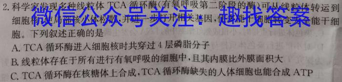 2.科学家发现多种线粒体TCA循环酶(有氧呼吸第二阶段的酶)可从线粒体运到细胞核,使局部核小体松散,并进一步打开相关基因,使多能干细胞转变为全能干细胞。下列叙述正确的是A.TCA循环酶进入细胞核时共穿过4层磷脂分子B.线粒体存在于所有进行有氧呼吸的细胞中,且其内膜比外膜面积大C.TCA循环酶在核糖体上合成,TCA循环酶缺失的人体细胞也能合成ATP全国100所名校最新高考冲刺卷第1页(共8页)【23·(新高考)高考样卷·生物学(一)·(-)⋅HAIN